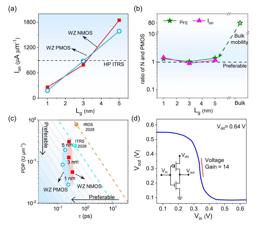因此,吕劲课题组首次通过第一性原理量子输运模拟研究了亚2纳米直径下,n型和p型环栅InAs NWFET的栅极长度(Lg)缩放行为。在环栅InAs NWFET中,原本存在于体材InAs中n、p型FET的巨大不对称性得以显著减小甚至消除。这是因为当直径小于3 nm时,轻空穴带反转到重空穴带之上(图1),并且随着直径的减小,量子限制效应逐渐增强,最终实现了p型器件性能的显著提高。通过模拟直径为1.2 nm的InAs NW的反相器,该课题组验证了采用单材料体系制备CMOS的可能性(图2)。此外,在应变工程的帮助下,可以通过减小有效质量和能隙来进一步提高开态电流(Ion)。