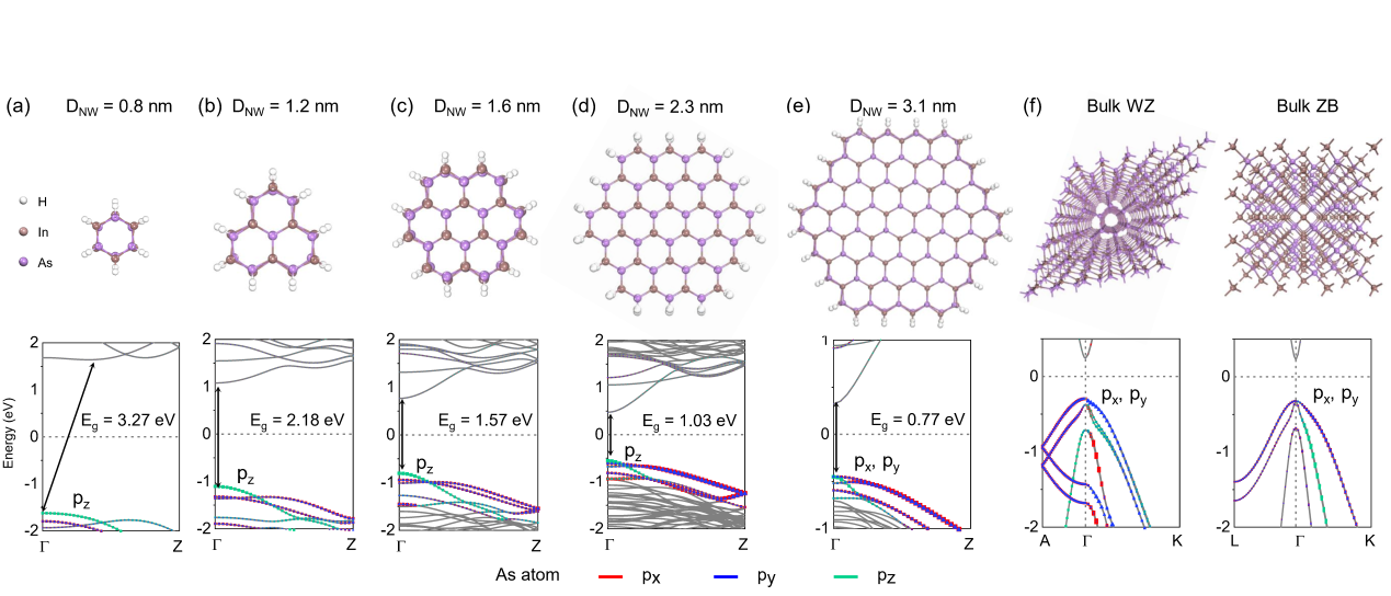 图1(a-e)直径为0.8、1.2、1.6、2.3和3.1 nm的纤锌矿相(WZ)InAs NWs(f)WZ和闪锌矿(ZB)相的体材InAs的结构及相应的能带结构,并将能带结构投射到pxpypz轨道上。