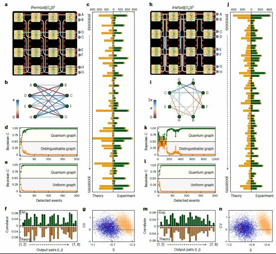 本实验室王剑威研究员和龚旗煌教授课题组与中国科学院、浙江大学、丹麦科技大学、英国布里斯托尔大学和澳大利亚西澳大学合作,经过6年的联合攻关,突破了大规模光量子芯片设计、加工、调控和实验测量的重重困难,发展出了基于互补金属氧化物半导体工艺(CMOS)的晶圆级大规模集成硅基光量子芯片制备技术和量子调控方法,实现了一款集成约2500个元器件的超大规模光量子芯片,实现了基于图论的光量子计算和信息处理功能,包括面向通用型量子计算的多光子高维量子纠缠制备,以可编程玻色取样专用型量子计算。该图论光量子芯片,实现了量子芯片与复数图的完全一一对应,图的边对应关联光子对源,图的顶点对应光子源到探测器的路径,芯片输出多重光子计数对应于图的完美匹配。通过编程该图论光量子芯片可任意重构八顶点无向复图,并执行与图对应的量子信息处理和量子计算任务。