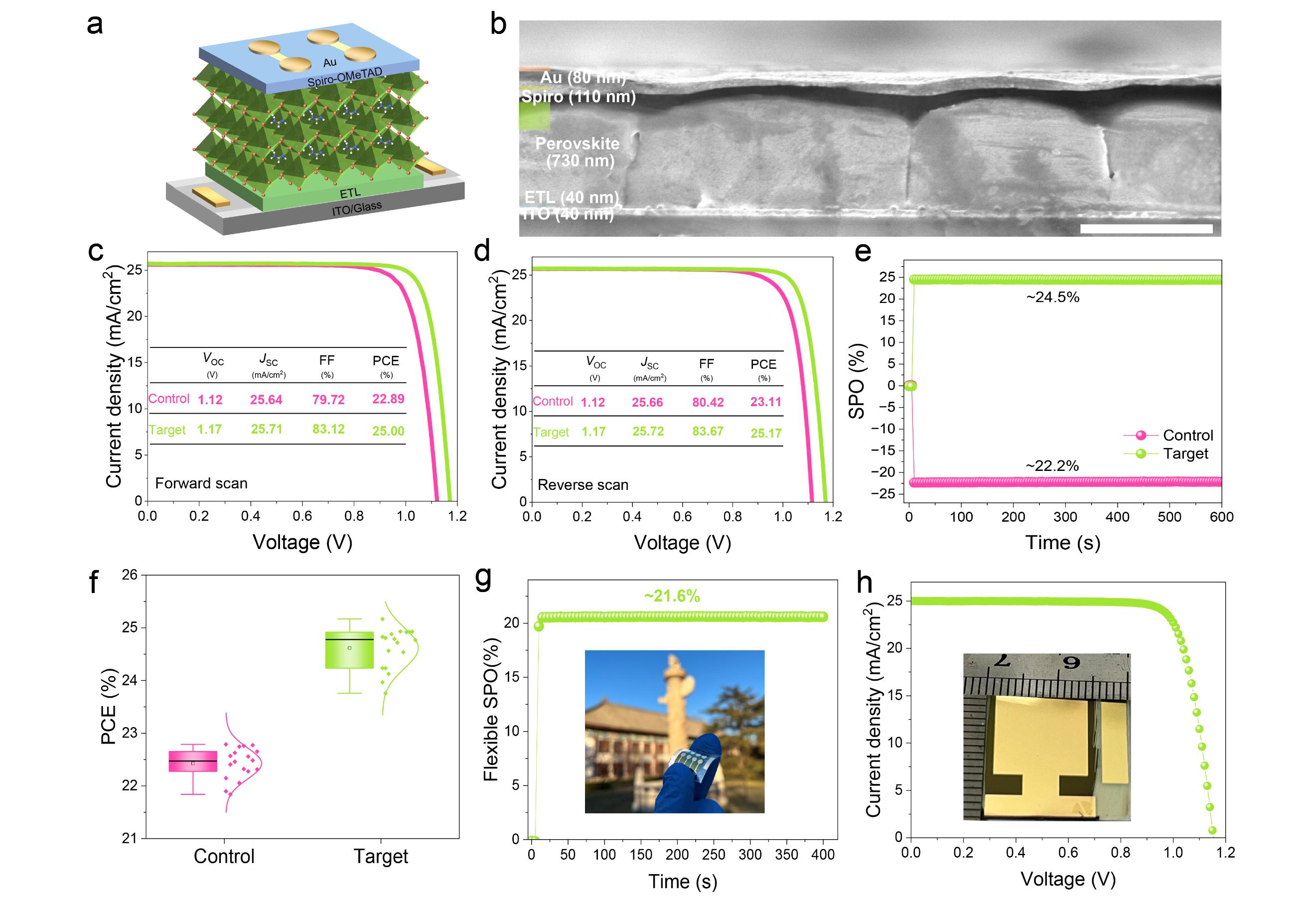 图3.改进的埋底界面大幅提升了钙钛矿太阳能电池光伏性能。a, b,钙钛矿太阳能电池结构示意图和横截面SEM图像,比例尺为1 μm。c,control和target太阳能电池在正向和反向扫描下的J-V曲线。e,control和target太阳能电池的稳态功率输出。f,control和target太阳能电池的PCE的统计分布。g,target柔性PSC的稳态功率输出。h,有效面积为1 cm2的target太阳能电池的J-V曲线。