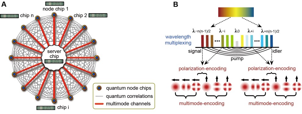 量子网络是量子通信、时频同步、分布式量子计算和量子传感等领域的重要基础支撑。大规模量子网络的构建关键在于如何实现大规模量子节点之间的复杂量子纠缠态分发与传输。其挑战在于,量子网络架构以及量子硬件必须具备强扩展性,同时能够有力地支持大容量量子通道中高维纠缠量子态的高保真相干传输。此前,基于波分复用的量子纠缠网络架构方案已有报道,有望用于大规模量子纠缠的网络分发,但尚缺少可扩展量子硬件的支撑。而集成量子光学芯片具有高可控性、强可编程性、小尺寸和低成本等优势,是实现量子信息处理、计算和通信等功能的优异平台,也被认为是实现大规模量子网络的关键硬件基础。