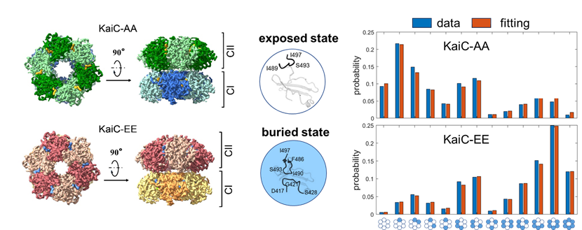 左图为KaiC-AAKaiC-EE的电子密度示意图;中图为A-loop的两种构象;右图为KaiC-AAKaiC-EE六聚体的A-loop构象分布的实验值和Ising模型的拟合值。