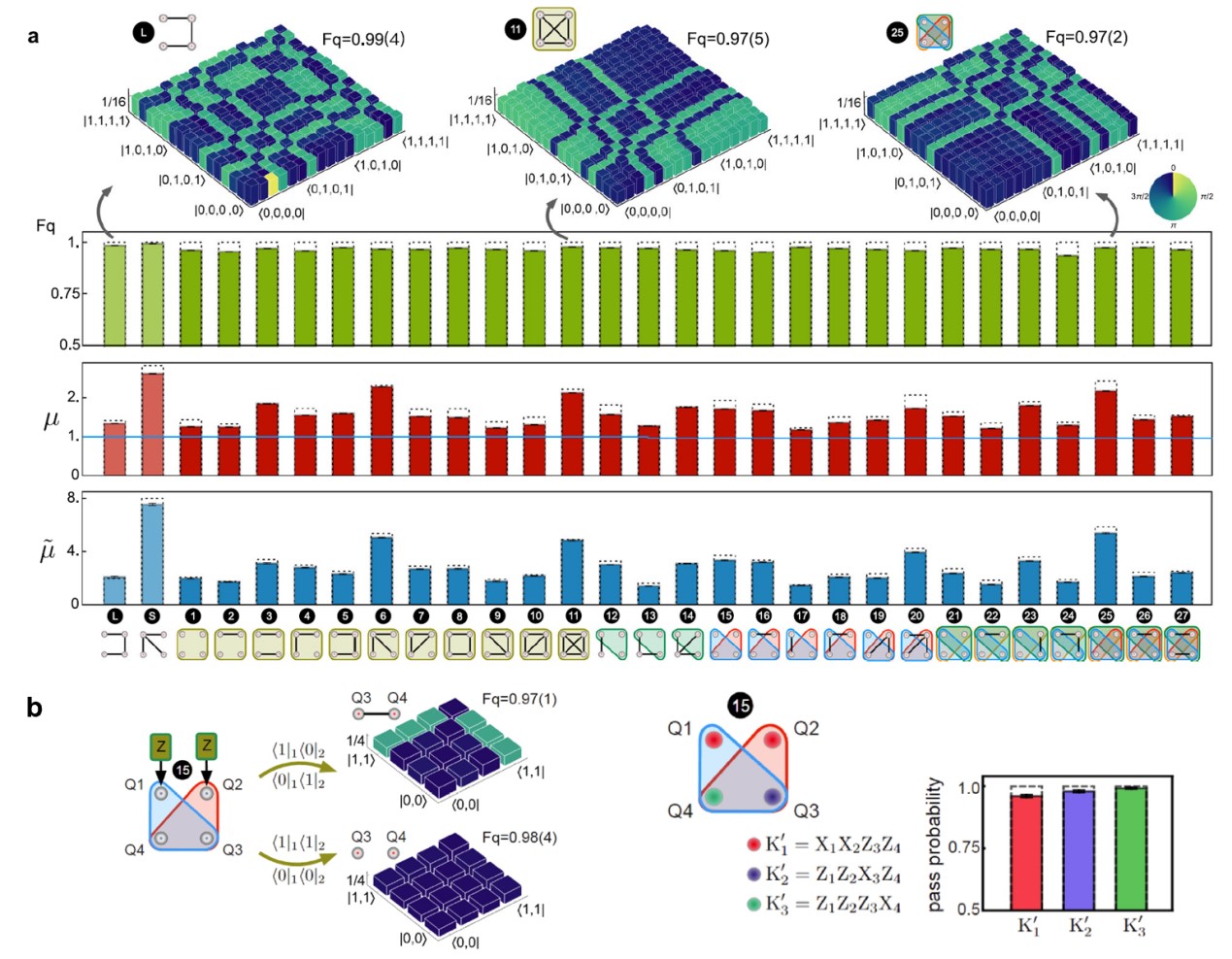 在该项研究工作中,研究团队发展出了一款硅基可编程光量子芯片(图2),通过希尔伯特态空间等价的方法,在实验上展示了对图1c中四比特完备超图态(基于局域幺正变换等价性)的制备、调控、测量与实验判定。实验中通过量子态层析、量子纠缠见证和Mermin不等式违背等实验,验证了所有27+2类超图态的高保真度制备和纠缠特性(图3a)。基于高保真制备的超图态,进一步在实验上演示了基于测量超图态的盲量子计算功能(图3b),包括:利用泡利测量进行超图态调控,颜色编码与验证。本工作展示了量子超图态作为量子图态的拓展,具有更加丰富的纠缠特性,有望应用于新型量子信息处理与通用量子计算。