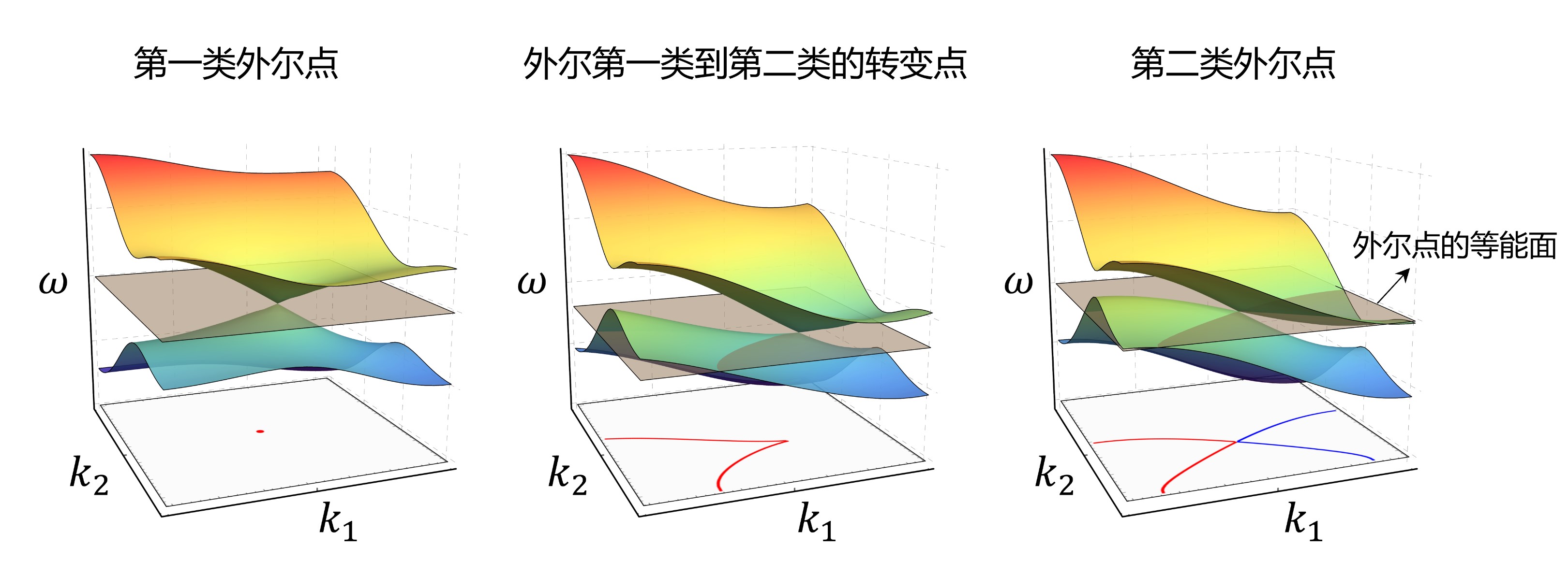 图3:(a)不同类型外尔点的能带结构;(b)厄米系统下的表面态费米弧及拓扑非平庸区域机械振子动力学演化行为;(c)非厄米系统下的外尔环结构以及趋肤效应影响下的拓扑模式。