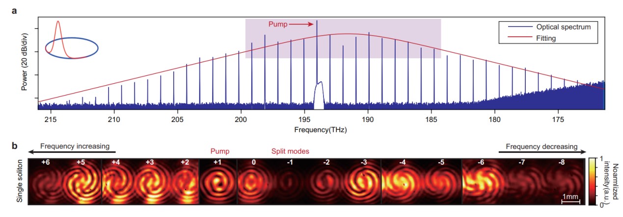 近日,人工微结构和介观物理国家重点实验室“极端光学创新研究团队”杨起帆研究员、刘文静研究员、肖云峰教授以及龚旗煌院士等人合作,在实验上首次基于光子芯片获得了携带轨道角动量特性的光学频率梳。2024年3月29日,相关研究成果以“集成涡旋孤子微梳”(Integrated vortex soliton microcombs)为题,发表于《自然•光子学》(Nature Photonics)。