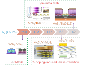 在金属-二维材料界面处常常形成金属诱导间隙态,从而产生高达103~106Ω μm的接触电阻。如图4所示,近期的实验工作中,利用扩散掺杂相变、半金属接触、二维金属接触等方法,实现了接近量子极限的接触电阻,最低的接触电阻可以达到42 Ω μm。