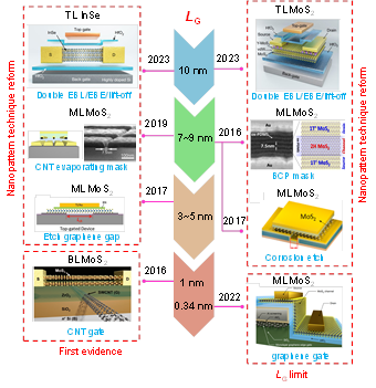 硅基摩尔定律由于短沟道效应的限制难以延续,二维材料是延续摩尔定律的潜在沟道材料。吕劲课题组之前的一系列理论计算表明,二维材料晶体管可以在亚10纳米物理栅长极限下满足下一代电子器件的性能标准(Quhe, R., et al., Phys. Rep. 2021),(图1)。研究成果曾获得2021年北京市自然科学二等奖和2021年中国电子学会科学技术奖自然科学三等奖。然而,由于实验技术的瓶颈,二维晶体管相对于最先进的硅晶体管的优势的理论预测一直缺乏具体证据。
