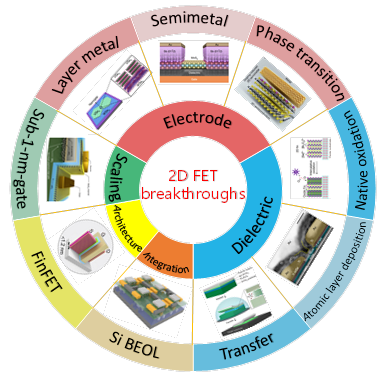为了达到二维材料晶体管的理论极限,需要在缩短物理栅长和沟道长度、优化金属-二维半导体接触、减薄有效氧化物厚度等方面实现突破(图2),而对于集成电路而言,还需要与传统的硅基工艺集成。近期的一系列实验工作在这些方面均有重大进展,国内学者表现非常突出。这篇综述总结了二维晶体管的最新实验进展。