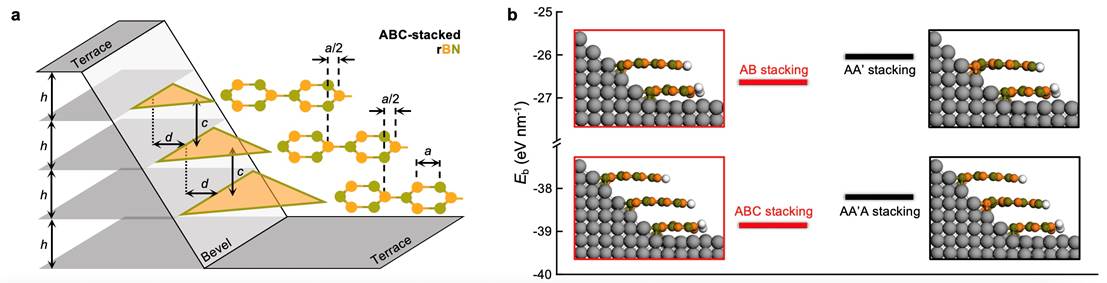 图1:倾斜台阶边缘锁定菱方氮化硼生长的物理机制