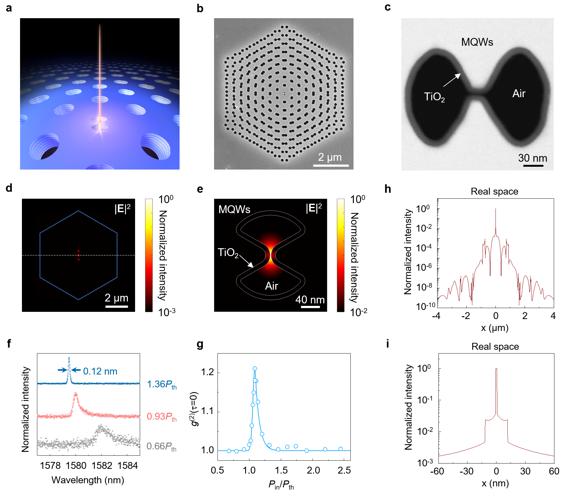 图4.奇点介电纳米激光。(a)奇点介电纳米激光示意图;(b)扫描电子显微镜照片;(c)奇点介电纳米激光中心蝶形纳米天线区域的扫描透射电子显微镜照片;(d)对数坐标下的场分布图;(e)对数坐标下中心蝶形纳米天线区域的场分布图;(f)奇点介电纳米激光在不同泵浦功率下的光谱图;(g)二阶相干函数随输入功率变化曲线;(h)对数坐标下的场分布截线图;(i)放大的对数坐标下的场分布截线图。