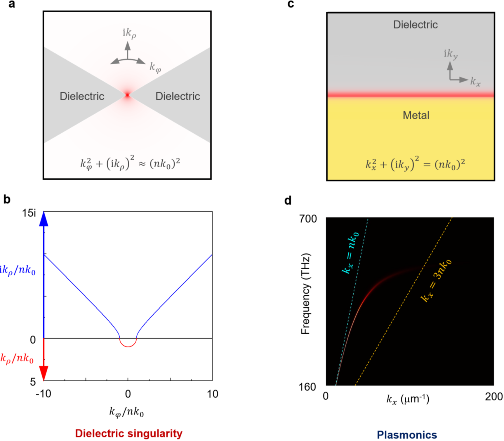 马仁敏课题组基于麦克斯韦方程构建了介电质体系突破光学衍射极限的理论,发现介电蝶形纳米天线顶点处的电场奇点源自动量的发散:在顶点附近,奇点的角向动量是实数,而径向动量是虚数,在靠近顶点处,这两个动量的绝对值发散,但是由这两个动量组成的总动量仍保持一个由材料介电常数决定的有限小值(图3)。该机制类似于等离激元模式的光场限制机制(在等离激元效应中,其为虚数的横向动量使得为实数的纵向动量增大),但确没有欧姆损耗。介电质体系中的电场奇点可以实现光场的极端压缩,光场的半高宽可远小于1纳米。