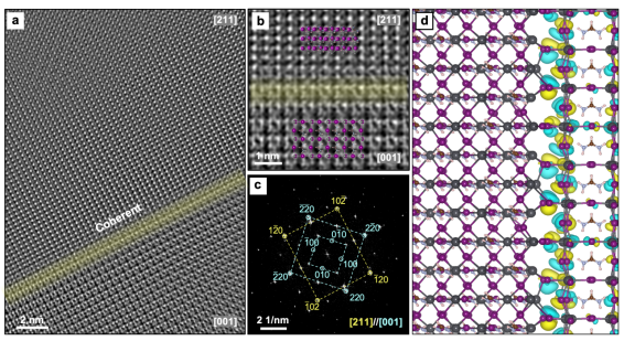 图2.原子尺度高分辨率冷冻透射电子显微镜Cryo-TEM图像相干晶界(a)钙钛矿[211]晶带轴与[001]晶带轴轴之间相干晶界的高分辨冷冻电镜图像;(b)相干晶界的放大图;(c)对应的快速傅里叶变换(FFT)图案;(d)相干晶界的理论原子模型。