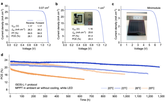 图3.电池光电转换效率及稳定性。(a-c)0.07 cm2电池、1 cm2电池以及迷你模组的最高光电转换效率;(d)电池稳定性。