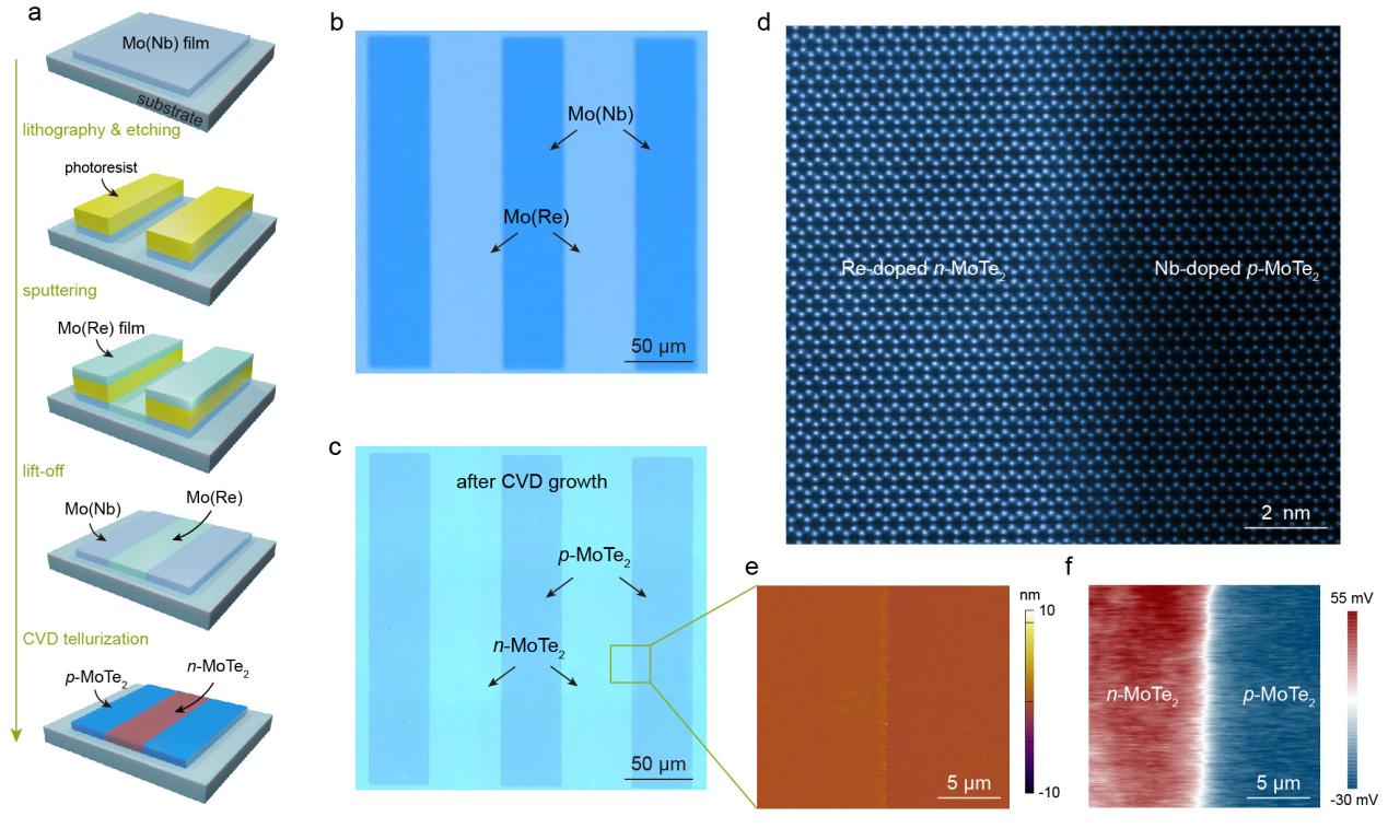 图3.对二维半导体碲化钼薄膜进行共溅射空间区域选择性掺杂及其扫描透射电子显微镜(STEM)和开尔文探针原子力显微镜(KPFM)表征分析。