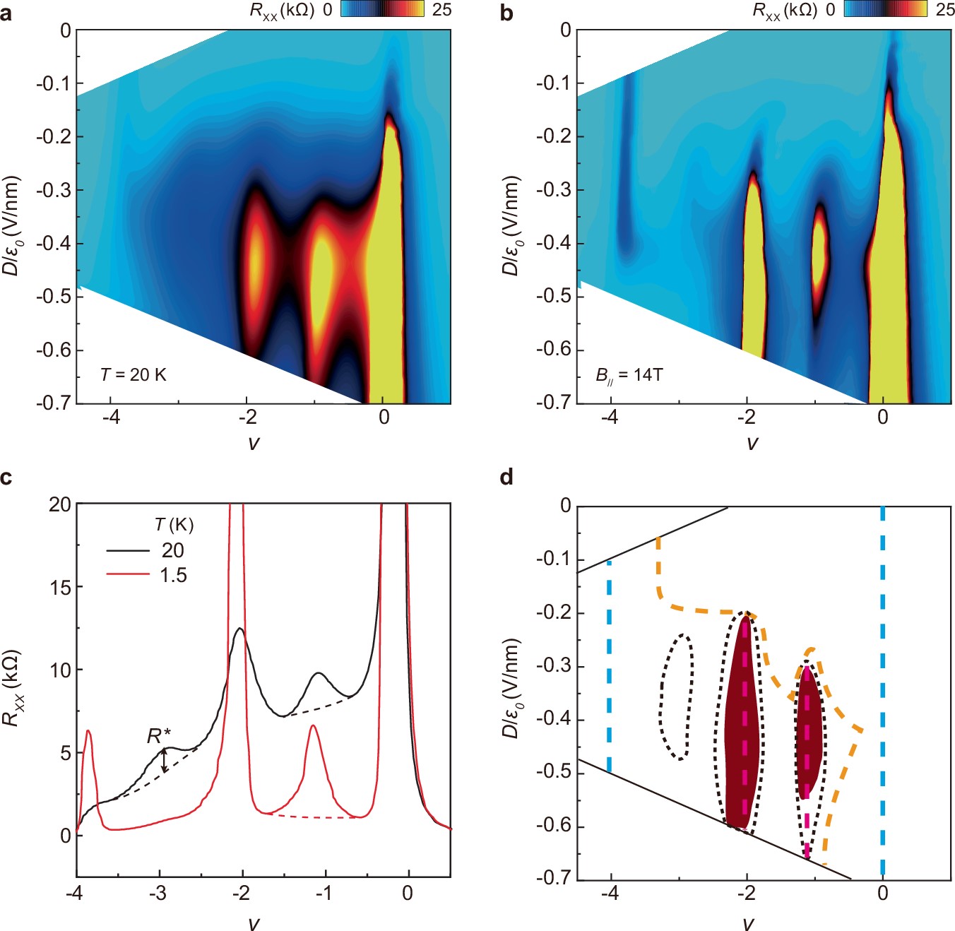 图四填充因子为-1和-2的区域,当电位移场较大时,电阻峰和载流子“重置”行为也有类似的温度和平行磁场依赖关系。