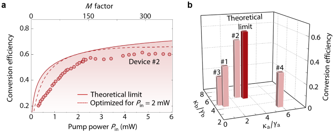 实验上,研究团队制备了高品质因子周期极化铌酸锂集成微腔。通过系统的实验表征,精确测定了关键因子M的数值,并据此确定了该关键因子对应的非线性临界耦合条件。为验证理论预测,团队创新性地开发了双色光场泵浦-探测技术,首次实现了对色散耦合和耗散耦合共同导致的效率抑制效应的原位观测与参数提取;基于实时监测数据动态调控微腔参数,最终成功达到非线性临界耦合条件。在毫瓦量级的泵浦功率下,研究团队实现了61.3%的片上二次谐波转换效率(如图2所示),创下了微腔光学平台的最高纪录。
