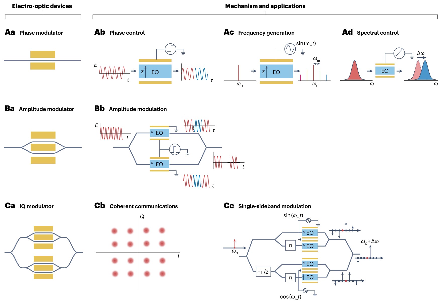 随着器件设计和纳米制造技术的迅猛发展,科研人员提出了多种电光调制建模与分析方法,以便深入研究不同频率与空间模式之间的交互过程。在电光调制的建模中,传统的相位变化理论描述光场因电场作用而获得的调制效应,模式耦合理论将调制过程视为不同频率模式间的能量交换,从而更准确地描述复杂系统中多模耦合的特性。理论与技术的双重驱动,使得TFLN平台在集成光电调控中迅速崛起,成为实现高带宽、低功耗调制方案的重要技术基石。