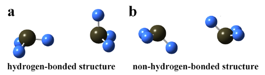 图1. (a) 氢键结构的氨气双聚体。(b) 非氢键结构的氨气双聚体。