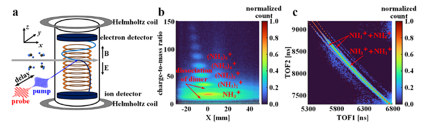 图2 (a) 实验装置图。冷靶反冲离子动量成像谱仪(COLTRIMS)用于测量氨气双聚体不同解离通道的解离产物三维动量谱 (b) 解离产物的分辨 (c) 解离通道的分辨。