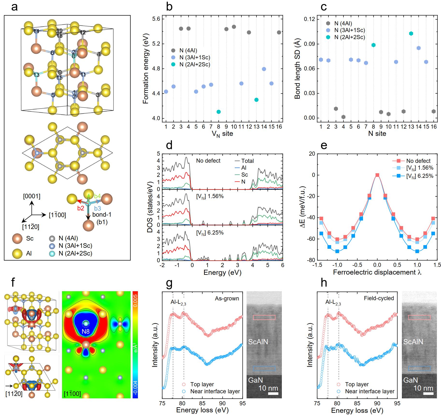 图5.铁电ScAlN中应变、氮空位和极化翻转势垒之间的联系。
