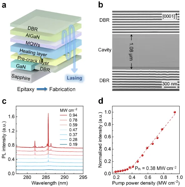 图a:本研究提出的AlGaN基深紫外VCSEL结构示意图。图b:AlGaN基深紫外VCSEL谐振腔的截面TEM图像。图c:波长285.6 nm深紫外VCSEL的光泵浦结果。图d:深紫外VCSEL的光泵浦阈值。