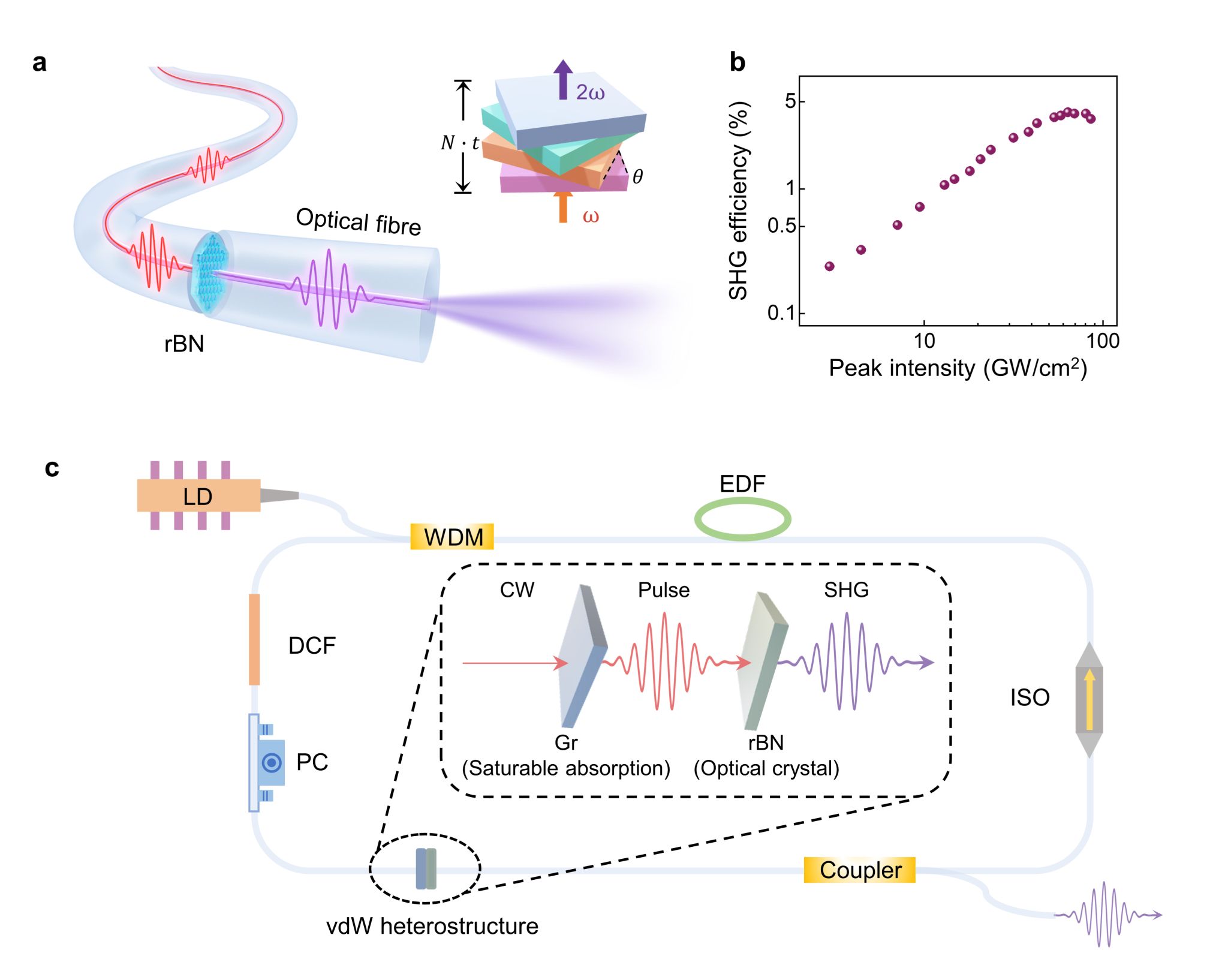 研究团队创新提出并实现了光纤端面范德华晶体集成的非线性光学晶体。通过在光纤端面精确堆垛多层菱方氮化硼(rBN)晶体,利用界面转角调控几何相位,发展了一种适用于线偏振光激发条件下的多层转角相位匹配机制。该方法规避了传统晶体厚度引起的模式失配问题,并突破了传统相位匹配理论在光纤集成中的兼容性限制,从而在十微米尺度内实现了高达4.1%的SHG转换效率以及90 Hz的SPDC二阶符合计数率。在此基础上,研究团队进一步利用光纤集成石墨烯/菱方氮化硼异质结复合器件,成功研制出全光纤锁模倍频激光器,同时实现锁模脉冲和倍频信号的输出。
