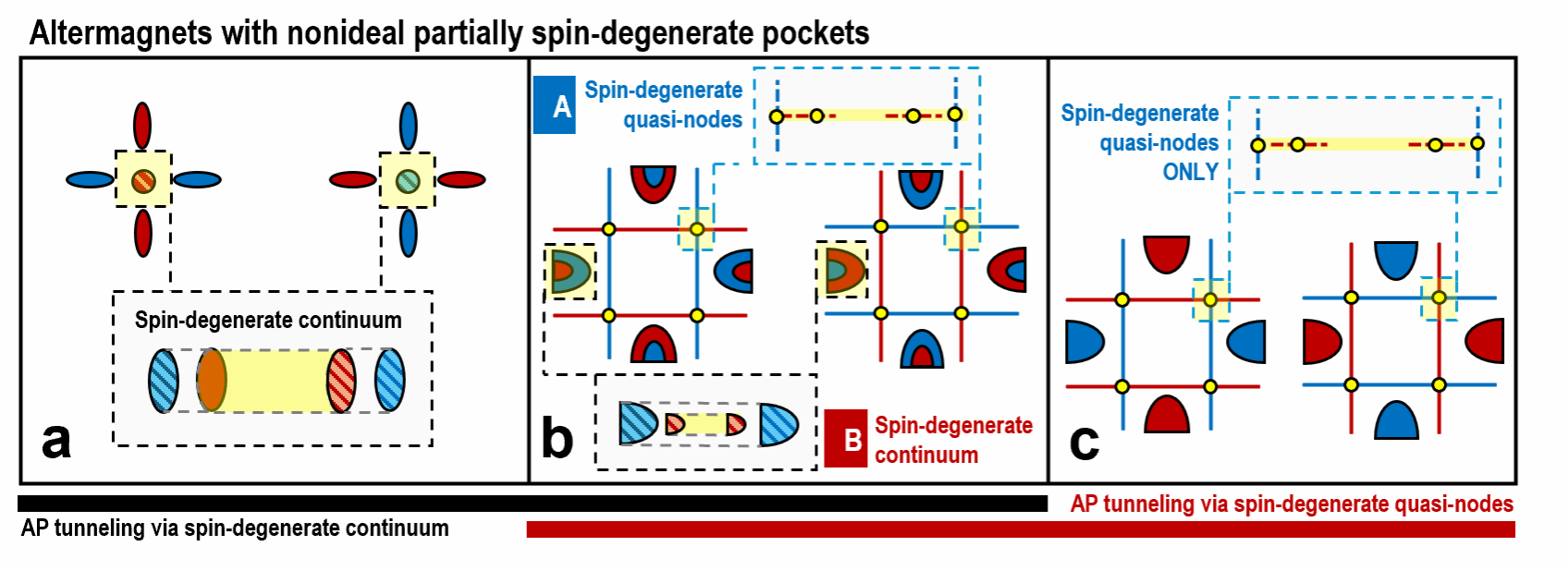 传统MTJ通常依赖铁磁材料作为电极,但铁磁体不可避免地会产生杂散磁场,对器件集成和稳定性方面造成一定限制。近年来兴起的交错磁材料(altermagnets)为这一问题提供了全新解决方案:这类材料在宏观上没有净磁矩,同时在能带结构中表现出类似铁磁体的自旋劈裂特征。换言之,交错磁材料同时具备无杂散场的反铁磁稳定性,以及自旋极化输运的铁磁功能性,非常适合用于自旋电子学和新型MTJ器件。