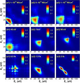 在第二个工作中,研究团队与合作者一起,利用推广优化后的氦原子双电离程序,在理论上预言了单个超短强XUV激光脉冲与He原子相互作用时在双光子双电离谱中将会出现一种新奇的双电子波包干涉现象。研究团队在他们前期双电离的虚序列图像下【Wei-Chao Jiang,et al.,Phys. Rev. Lett. 115, 153002 (2015)】,进一步加上强场近似的思路,建立了相应的半解析模型,明确解释了导致双电子能谱中干涉结构的物理机制。他们系统的理论研究表明,这种双电子能谱上新型的网格状干涉结构,与超短强XUV激光脉冲下的动态干涉效应、双电离的多电离通道、以及两电子的交换对称性等密切相关。他们的研究表明,与单电离过程中的动态干涉相比,双电离中动态干涉出现的条件更为宽松,为动态干涉在实验上的验证提供了新的可能。该工作近期发表在《物理评论快报》上【Wei-Chao Jiang*, Si-Ge Chen, Liang-You Peng*, and Joachim Burgdörfer,Phys. Rev. Lett. 124, 043203 (2020)】,深圳大学青年助理教授姜维超为第一作者,部分工作在人工微结构和介观物理国家重点实验室的开放课题的支持下完成。