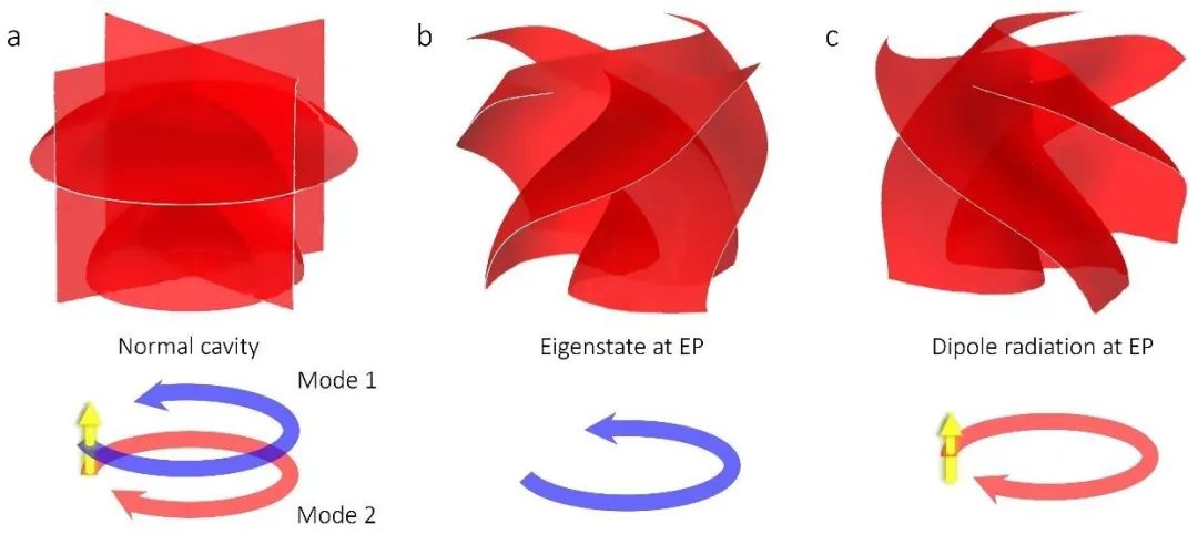 图1(a)普通环形谐振腔在一共振频率下有两个正交的本征态,处于共振频率的光源与其相互作用会同时激发出这两个本征态。(b)处于奇异点,共振频率上只存在一个逆时针传播本征态的环形谐振腔。处于共振频率的光源与其相互作用激发出了体系中不存在的顺时针传播的本征态。(c)环形谐振腔中本征态随着时间-宇称对称折射率调制的演化。在奇异点处两个本征态是完全平行的。