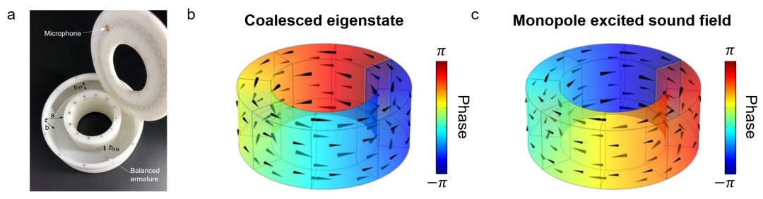 这一物理现象在波与物质相互作用中具有普适性,不仅在电磁波体系中存在,而且在机械波系统中也存在。团队在宇称-时间对称折射率调制的声学腔中也观测到了此现象(图3)。图3a中腔体内壁的声学人工结构能够在复平面上调节等效折射率,使其满足宇称-时间对称并工作在奇异点附近。此时腔体内的本征态是非厄密简并的逆时针模式。而当一个单极子声学点源被放入腔体内的特定位置时,激发的顺时针单向声场呈现出与本征态完全相反的手性。这一独特现象暗示了声学轨道角动量调控的一个额外自由度,为声学通信和粒子操控带来了全新的可能。另外,声波不具有自旋属性,而团队所展示的这种手性声场则可以充当声学系统中的赝自旋,服务于拓扑声学的研究。