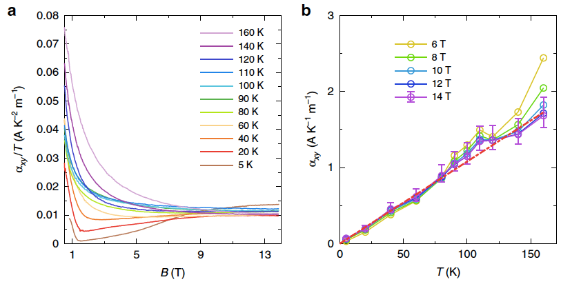 该项研究制备了的高品质ZrTe5晶体,样品具有极低的载流子浓度和超高的迁移率,从而能够探测狄拉克点附近的本征性质。实验测量了材料在低温、高磁场下的热电性质。热电效应是依靠温度梯度产生载流子输运的过程。电输运受外在因素,如杂质散射的强烈影响,且本质上为非平衡态,而霍尔热电导反映体系的本征平衡态热力学性质。研究发现,热电塞贝克系数和能斯特系数在磁场下显著且持续增强,证实了以前的理论预言。更重要的是,在量子极限下,不同温度的霍尔热电导逐渐趋于一个正比于温度的平台。平台值与磁场大小、杂质散射、载流子类型、浓度等均无关,仅与费米速度和一些自然常数相关,反映了体系的内在性质。理论分析表面该平台的出现是三维狄拉克/外尔费米子在量子极限下的独特输运行为,为研究此类拓扑体系提供了独特的研究手段,也证明了拓扑半金属材料在热电领域的应用潜力。