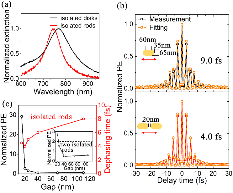 在表面等离激元光子学实验中,利用PEEM高空间分辨率的优势直接观测到金纳米结构二聚体阵列体系中局域表面等离激元模式的近场分布(图1),通过激发光波长依赖的光发射强度测量和基于超短脉冲的光发射自相关测量,分别获得同一结构的表面等离激元的近场增强和退相干时间,发现两者之间的关联依赖于金纳米结构二聚体间隙和激发光的偏振方向(图2和图3),首次揭示出这种关联性由近场远场耦合和纳米结构局域作用共同决定。研究成果对于理解表面等离激元光子学中的基本物理问题以及拓展表面等离激元在高灵敏检测与传感、太阳能电池等微纳光子器件应用研究具有重要意义。