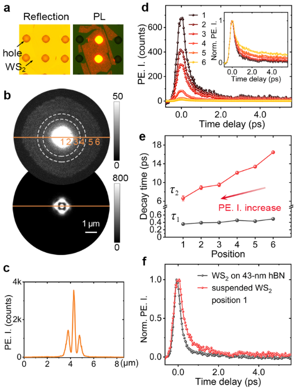 在单层WS2超快电子冷却和弛豫动力学过程研究中,团队发现衬底上的和悬空的单层WS2都存在的两个时间尺度的超快动力学过程(图4),分别归于导带的电子冷却和缺陷捕获过程,从衰减曲线可以观察到两个时间尺度的过程,分别为0.3 ps和3 ps左右。通过能量分辨的PEEM测量(图5),发现第一个过程与电子在导带的冷却相对应,第二个过程反映了电子在导带底的弛豫。通过对比悬空的单层WS2样品的PEEM测量(图6),并结合荧光光谱和拉曼光谱表征,发现该弛豫过程主要与缺陷态有关。此项研究借助于PEEM在空间、时间与能量等多维度的分辨能力,揭示了典型TMDs材料单层WS2超快的电子冷却和缺陷捕获的动力学过程。研究还发现缺陷态的产生与真空下光照有关,这种缺陷的产生方式及其对动力学过程的显著影响,在一般的光发射实验和光谱测量中值得注意。