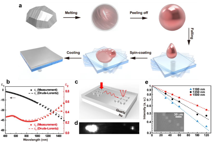 金属钠膜的制备是钠基等离激元器件首先需要解决的问题。研究团队发展了独特的液态金属旋涂工艺,制成了金属钠薄膜,首次揭示了金属钠膜的优异光波段等离激元特性(图1)。研究结果证实金属钠的自由电子弛豫时间约为金属银的两倍,在1500纳米附近表面等离激元在钠-二氧化硅界面的传播长度可达200微米以上,波导的品质因数是金属银的两倍以上。