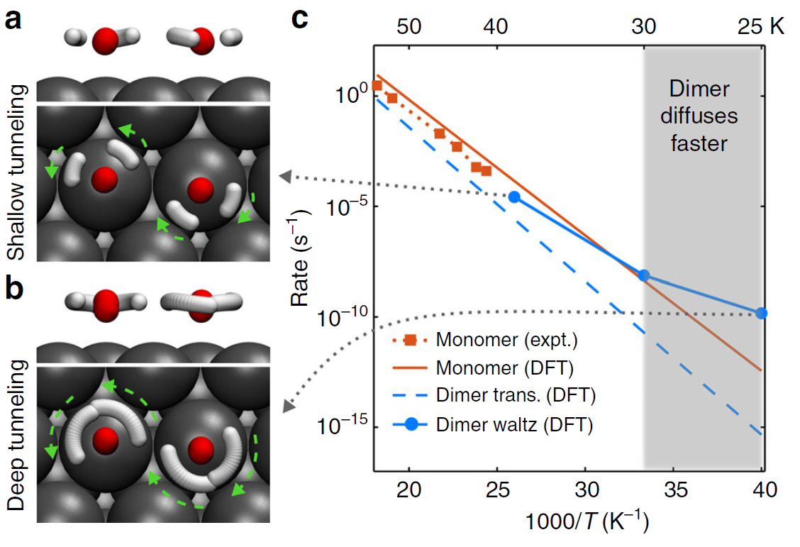 图2. a)与b)水的二聚体在不同温度下隧穿过渡态构型示意图。c)水分子与二聚体漂移速率随温度的改变。b)中显示出的深隧穿机制牵扯到氧原子的非局域化,为低温下二聚体相对于单分子具有更高的漂移速率提供了最合理的隧穿通道。