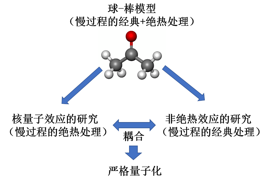 图1.凝聚态物性模拟中不同计算方法的相互关系示意图。球-棒模型是目前人们最为常用的理论描述方法。在此基础上,人们可以引入核量子效应、非绝热效应,甚至是在一些简单模型中考虑两者之间的耦合。这些都是目前物质科学研究中的前沿领域。