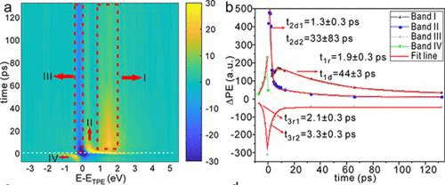 时间分辨能量谱(图3)则进一步揭示了处于高激发态的电子以皮秒尺度转移至表面缺陷态并被束缚,缺陷态的动力学占据了表面电子弛豫的主要部分,导带自由电子的衰减在表面只占有很小的比例。这种动力学特性是钙钛矿表面动力学的主要特征,均匀地分布在整个钙钛矿表面。这表明制约钙钛矿性能的主要因素是材料表面的深能级缺陷,进行表面缺陷钝化对钙钛矿材料器件器件性能提升具有重要意义。
