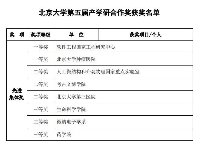 其中,北京大学产学研合作先进集体奖获奖名单如下: