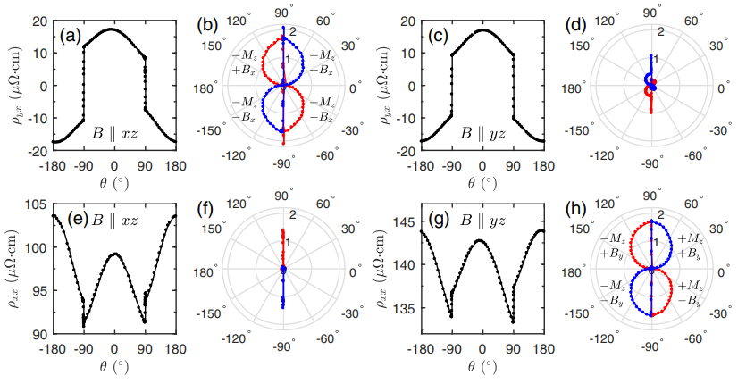 (a-b) 磁场沿xz平面时出现手性依赖的霍尔信号;(c-d) 磁场沿yz平面时手性依赖的霍尔信号近乎为零;(e-f) 磁场沿xz平面时手性依赖的磁阻信号为零;(g-h) 磁场沿yz平面时出现手性依赖的磁阻信号