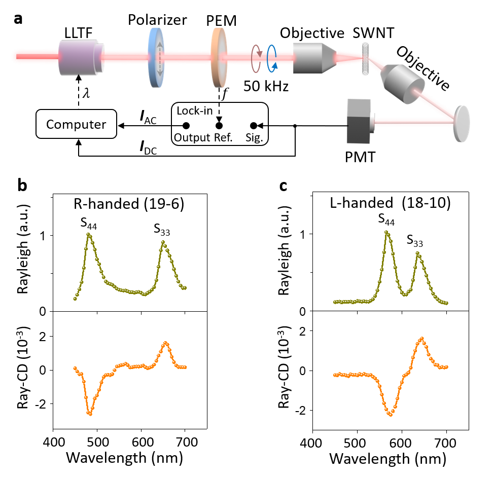 图2 (a)单根碳纳米管瑞利散射圆二色性光谱技术装置示意图;(b-c)单根碳管手性指数及螺旋性表征结果,其中瑞利散射峰能量用于标定碳管的手性指数,瑞利散射圆二色谱符号用于进一步标定碳管的螺旋性