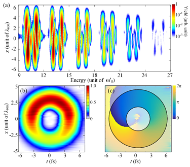 图2 (a)反向自旋-反向涡旋的双色时空涡旋光束驱动产生的HHG谱;(b)极紫外STOV的时空强度分布;(c) 极紫外STOV的时空相位分布