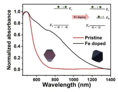近日,人工微结构和介观物理国家重点实验室曲波副教授、陈志坚教授和肖立新教授联合研究团队采用降温结晶的方法合成了铁掺杂的双钙钛矿Cs2AgBiBr6单晶,通过实验发现了Fe(铁)掺杂可以将Cs2AgBiBr6的光吸收范围由橙光波段(⁓610 nm)拓宽至近红外波段(⁓1350 nm)(图1),这是目前国际上所报道的具有最宽光谱吸收范围的无铅钙钛矿。