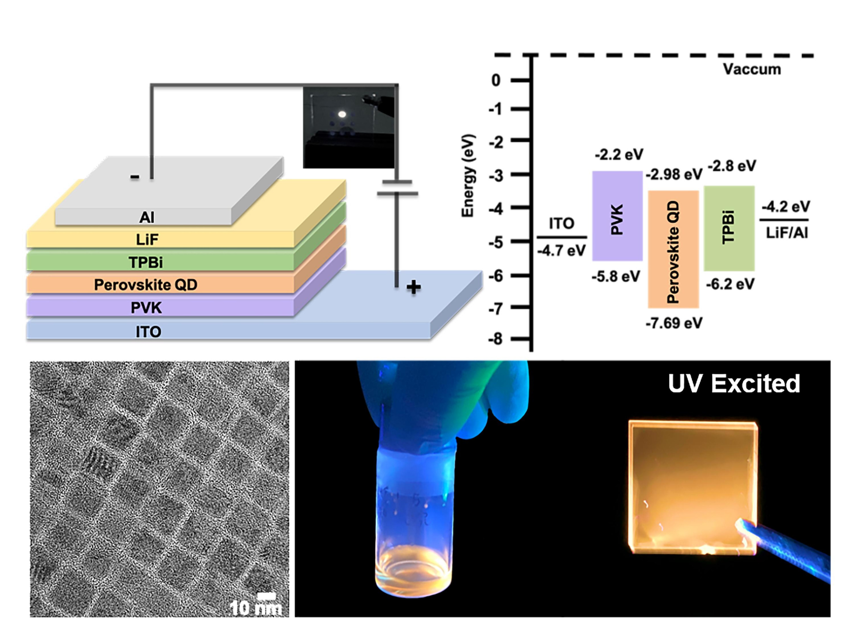 另外,无铅双钙钛矿量子点具有宽谱发射的特性,适于制备白光二极管器件,但目前国际上相关研究多集中于光致发光方面,电致发光器件方面的研究很少。
