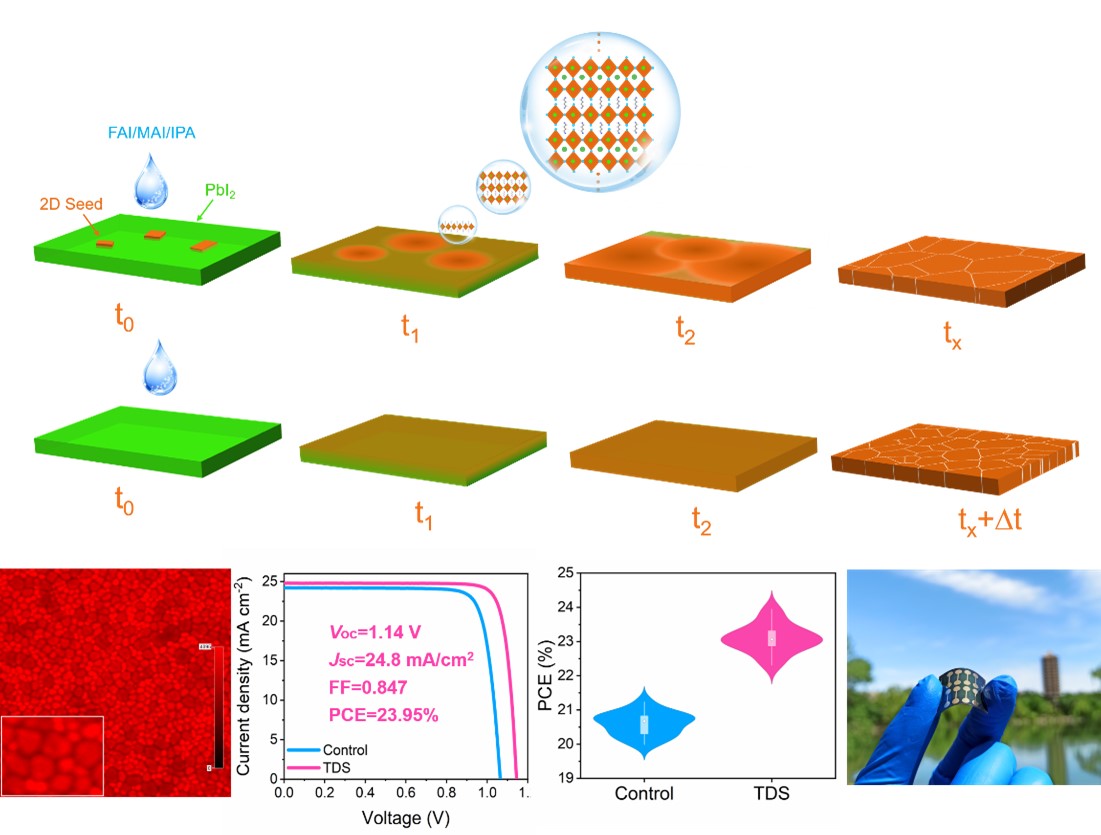 图2 二维晶种诱导生长原理示意图,钙钛矿薄膜与光伏器件效率展示以及柔性器件照片