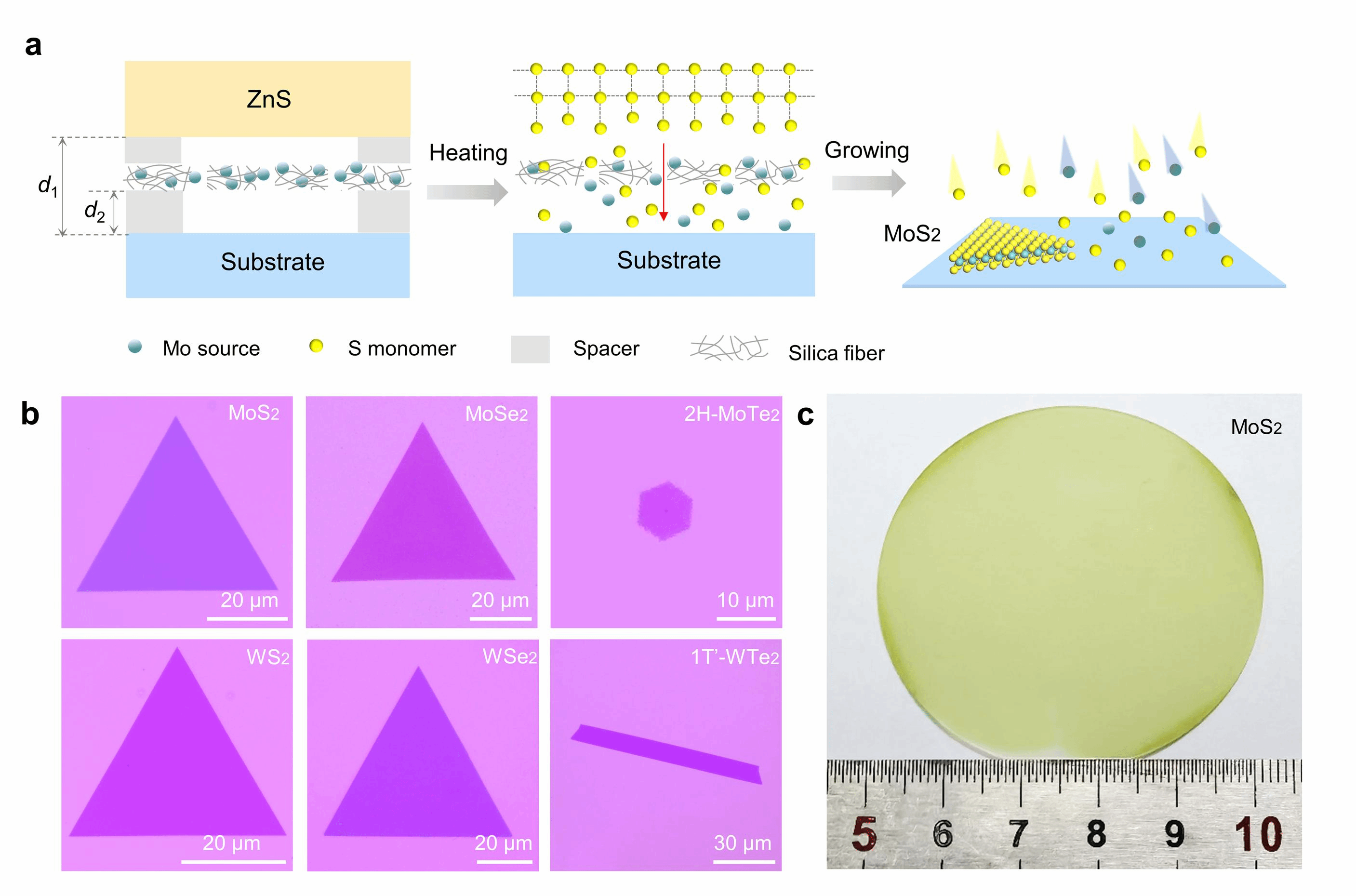 图 a 硫族单原子供应制备过渡金属硫族化合物示意图;b 普适性制备不同种类TMDs;c 两英寸晶圆级高品质单层MoS2