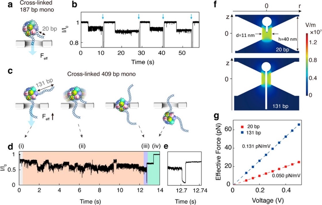 图1 (a-e)交联核小体的穿孔示意图和离子电流信号;(f)COMSOL模拟核小体被纳米孔捕获后孔内的电场分布;(g)作用在DNA上的力随电压的变化