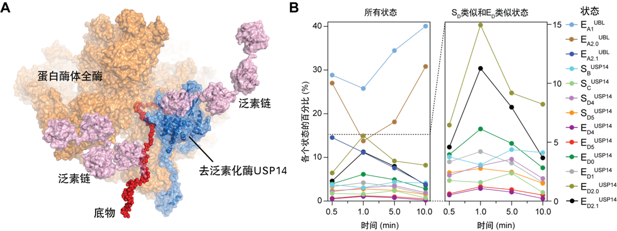 图1 (A) USP14调控下蛋白酶体复合体降解多泛素化底物的原子结构模型之一;(B) 时间分辨率冷冻电镜解析13种中间态的统计分布随蛋白质降解进程的时间演化(Youdong Mao, CC BY 4.0)