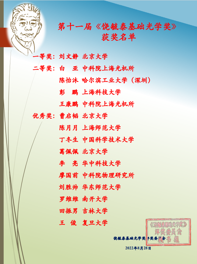 饶毓泰基础光学奖每三年评选一次,《第十一届饶毓泰基础光学奖》评选活动自2022年6月启动,共收到来自全国24个单位32位候选人的申请,经过专家两轮评审,评选出一等奖1人,二等奖4人,优秀奖10人。