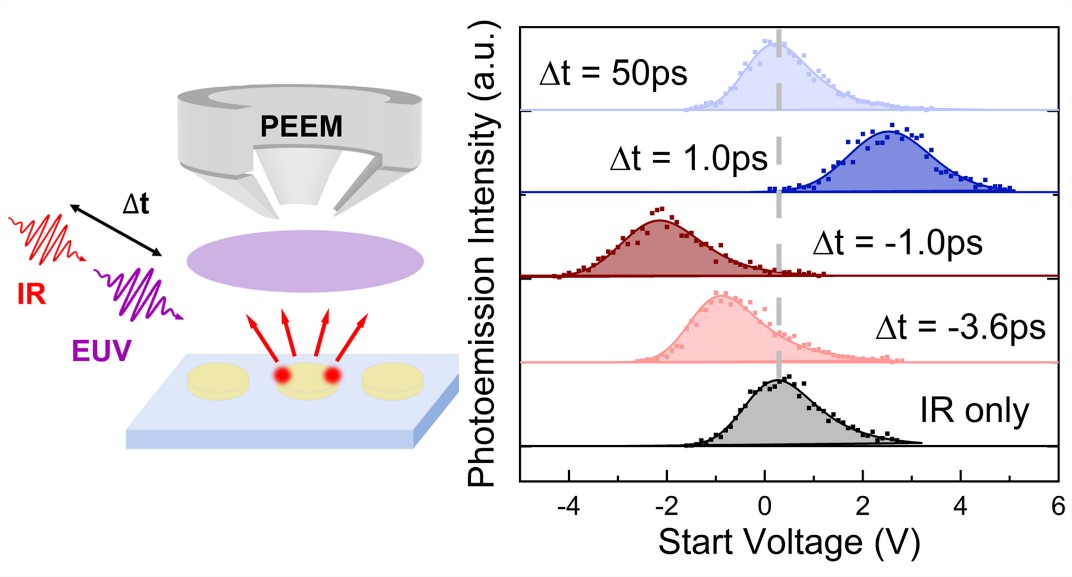 图2:极紫外和红外光照射下金纳米结构光电子发射示意图(左图)以及不同延时下的光电子能量峰值存在移动(右图)。