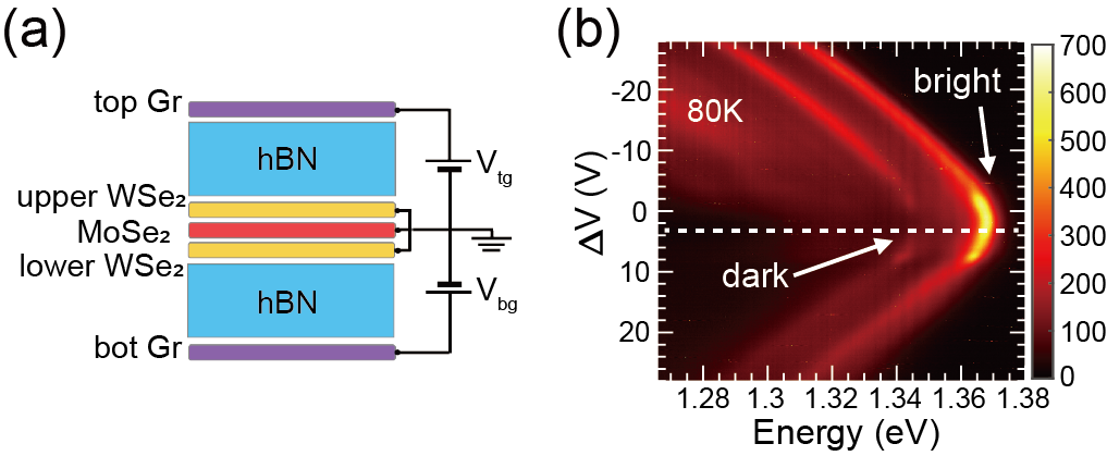 (a):三层异质结的双栅器件结构示意图;(b):电场调控的亮暗电四极激子光谱。